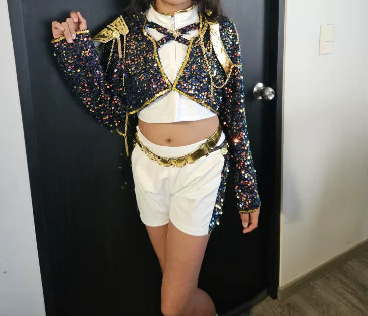 Transform any event into a dazzling K-Pop experience with this vibrant costume. Featuring sparkling gold sequins and a stylish design, it's perfect for young performers and Halloween fun.